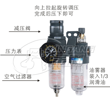 該氣源處理三聯件包括空氣減壓閥,過濾(lǜ)器、油霧器三大件。其中(zhōng)威壓閥可對氣源進行穩壓,使氣源處於恒(héng)定狀態,可減小因氣源(yuán)氣壓突變時對閥門或執行器等到硬件的損傷。過(guò)濾器(qì)用於對氣源的清潔。可過濾(lǜ)壓縮空氣中(zhōng)的水分,避免水分隨氣體進入裝置。油霧器可對(duì)機體運動部件進行潤滑。可以對不(bú)方便加潤滑油(yóu)的部件進行潤滑,大大延長機體的使用壽命。o